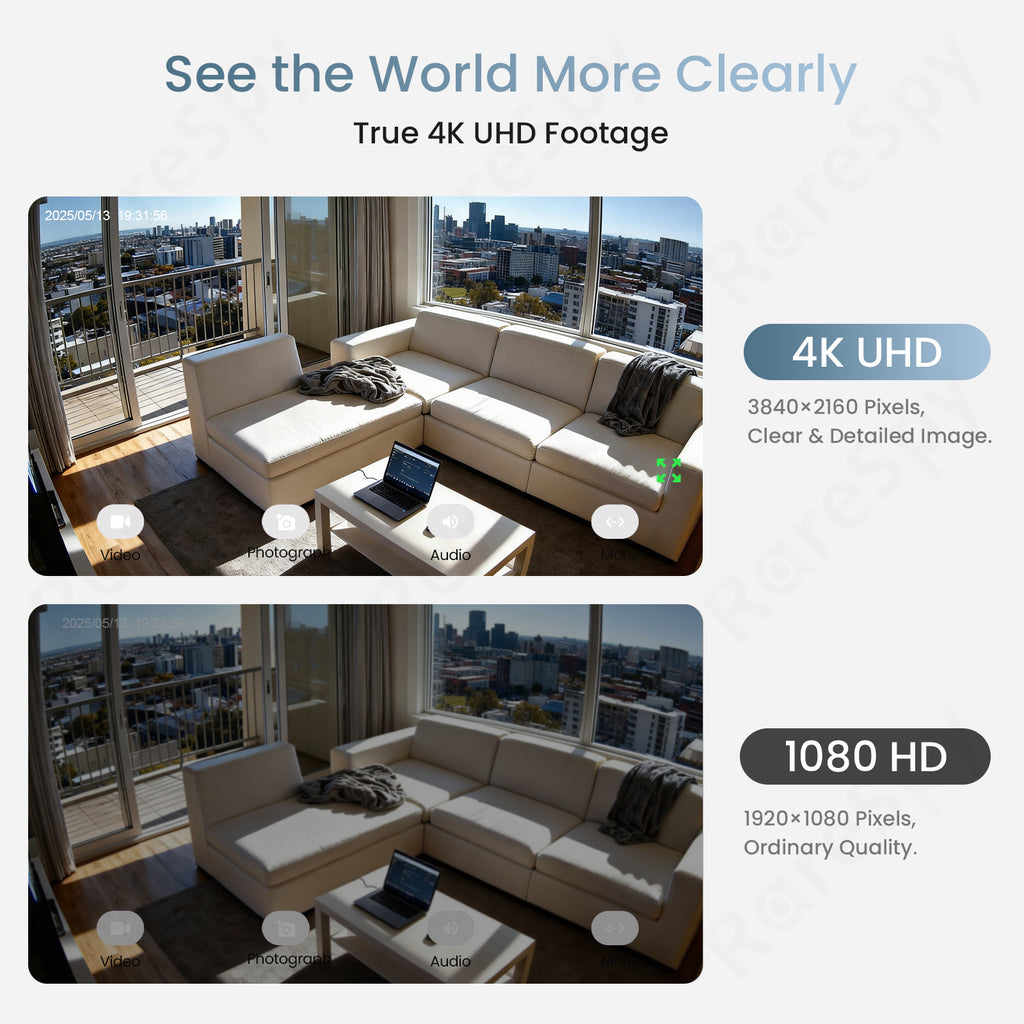 🎥 Ultra-High Definition 4K Video: Equipped with an HD lens and 130° wide-angle view, capturing crystal-clear details. Easily switch resolution (4K/2K/1080P/720P) via the dedicated APP. Perfect for pet monitoring, nanny cam recording, or home security.